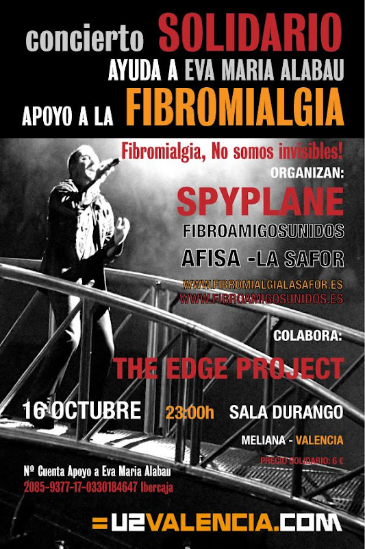 El próximo viernes 16 tendrá lugar un Tributo Solidario U2 en la Sala Durango de Meliana (Valencia), con los grupos Spyplane y The Edge Project. En breve os daremos todos los detalles del evento.